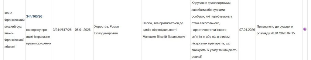 Справу щодо Віталія Матешка розглядає Івано-Франківський міський суд, засідання призначене на 20 січня 2026 року о 09:15. Зазначимо, що інформація про це провадження була оприлюднена в реєстрі 7 січня 2026 року. Цей випадок викликав обурення серед громадськості, адже чиновник вже не вперше потрапляє у подібні ситуації.