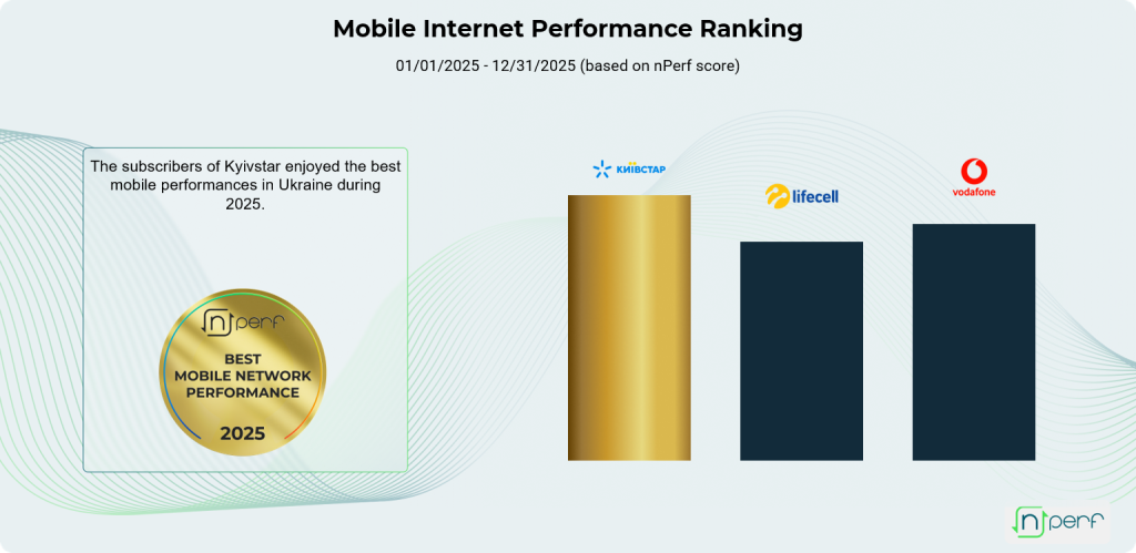 Незалежна платформа для тестування та аналізу продуктивності інтернет-з’єднання nPerf оголосила результати дослідження швидкості мобільного інтернету в Україні за 2025 рік. За даними аналізу, оператор мобільного зв’язку “Київстар” продемонстрував вражаючі результати, зайнявши перше місце в рейтингу. Середня швидкість завантаження склала 40,85 Мбіт/с, що є значним зростанням на 13% у порівнянні з попереднім роком. Швидкість вивантаження також вражає — 14,45 Мбіт/с.